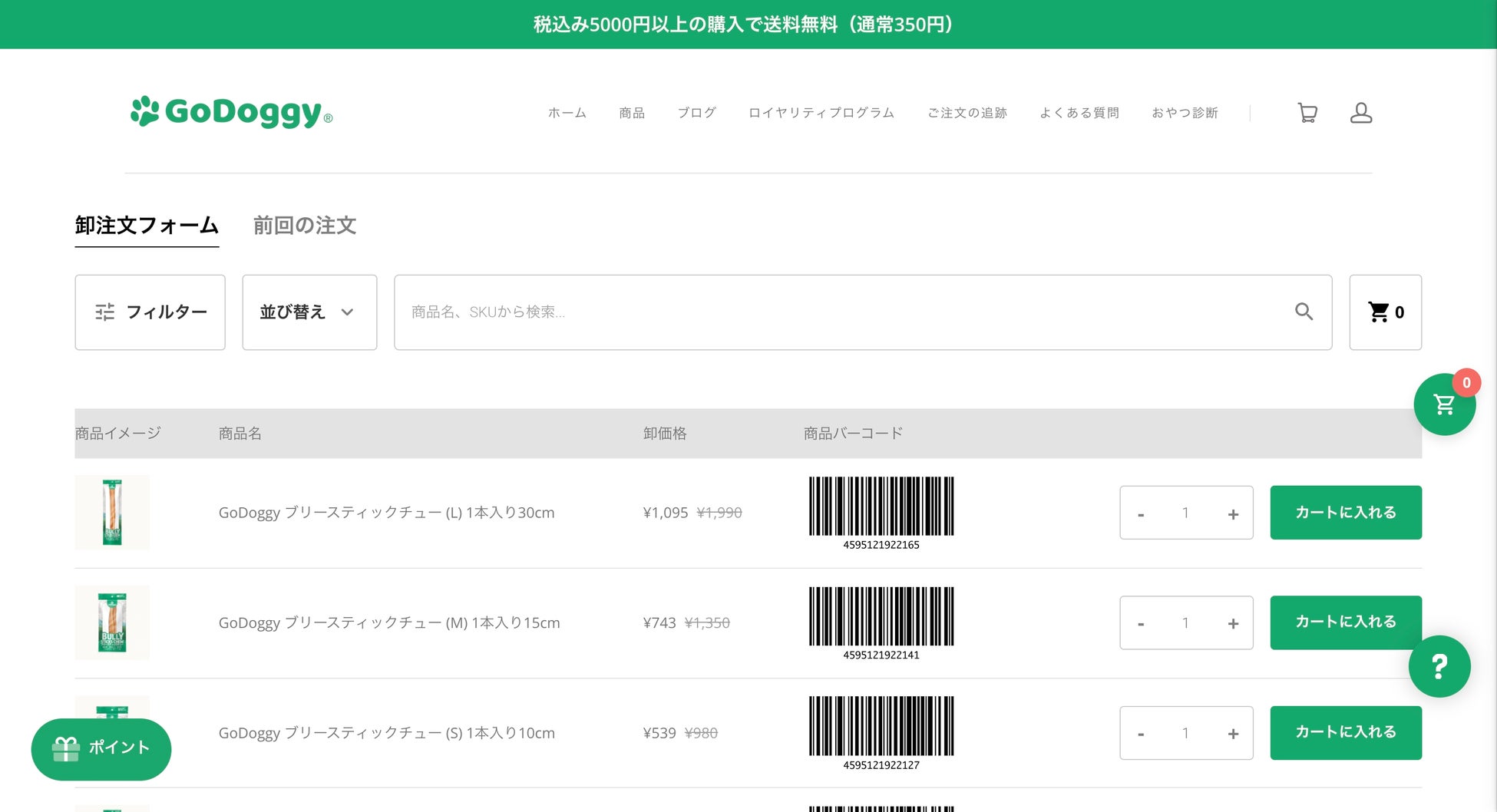 現在個人向けに展開している犬用おやつ全16商品を卸売価格でお届けします。通常ご注文後1~3営業日以内の発送で、送料は無料です。注文金額は4万円(税抜)から。1年あたりの最低注文金額の設定はなく、年会費も無料です。会員登録フォームに必要事項を入力し、GoDoggyの承認が下りれば卸売りサイトからの購入が可能になります。今後、卸売りサイトでは販売店の検索もできるようになる予定です。